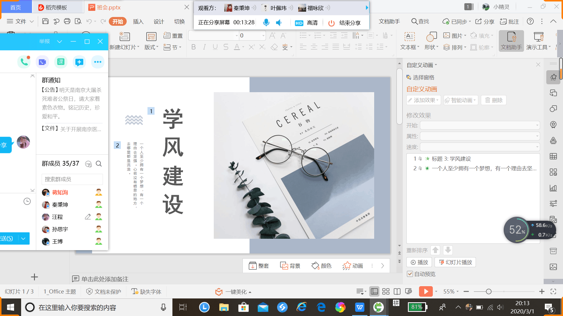 班会伊始,学习委员就上学期的学习成绩总结了班级学习情况,分析了班级学习中存在的问题,指出作为大一新生面对全新的大学学习与生活,要勇于克服困难,保持良好的学习习惯。同时激励大家,过去的已经过去,在本学期要查漏补缺,更加努力向上。接着优秀代表万天成同学发言。他认为学习就像打仗:首先,打仗需要缘由,学习亦是如此,理想使我们产生强烈的信念感,于是我们为实现理想而学习;其次,打仗需要战略,我们学习也要讲究劳逸结合;最后,如同战士们鼓舞士气一般,学习也要调整好心态。叶佩玮、徐子宁同学也相继分享了她们对学习的一些见解,强调了认真听讲、复习以及作息规律的重要性。