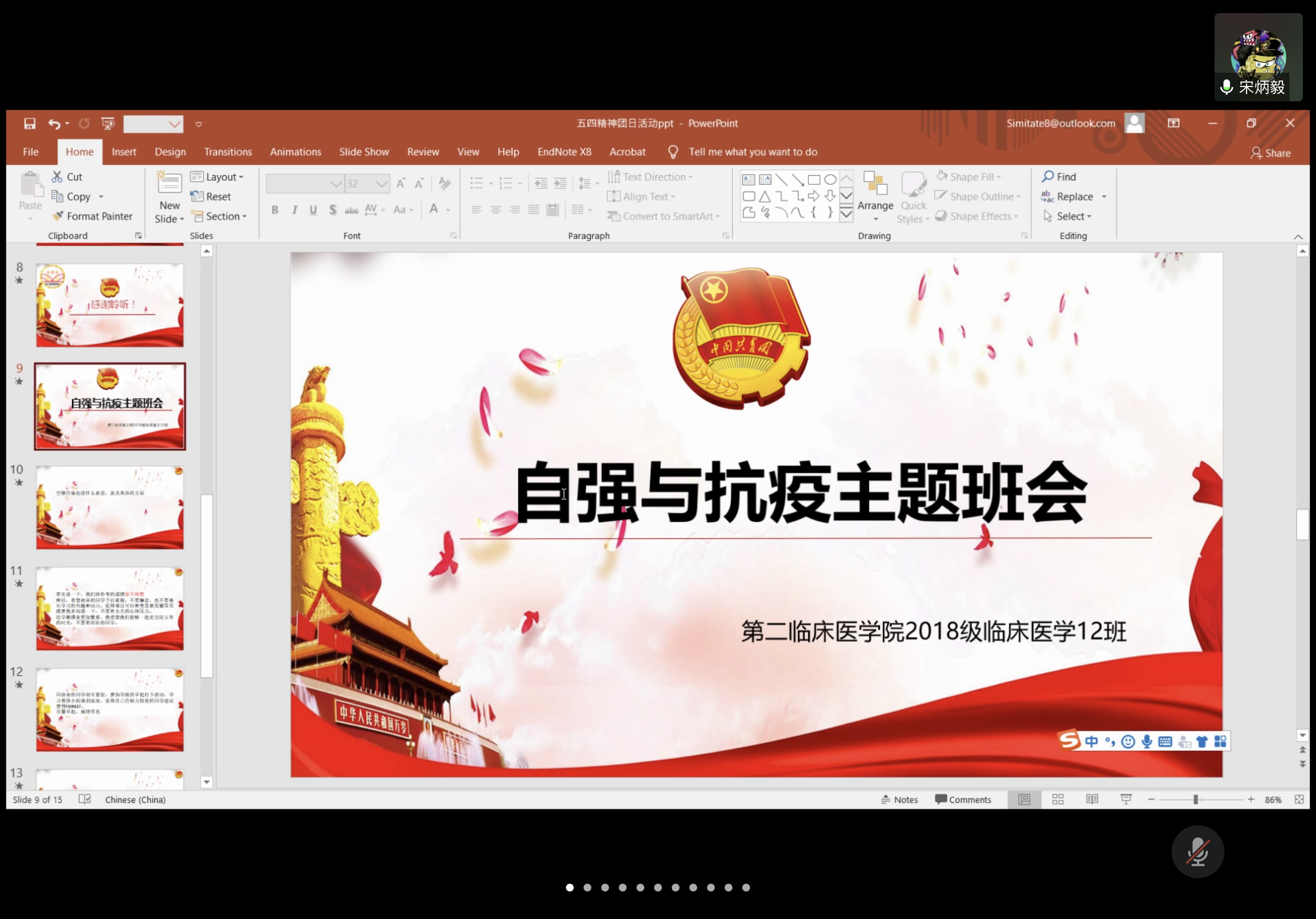 5月12日,2018级临床12班在线上开展了一次“自强与抗疫”为主题的信仰公开课,兼职班主任魏新程老师共同参加。