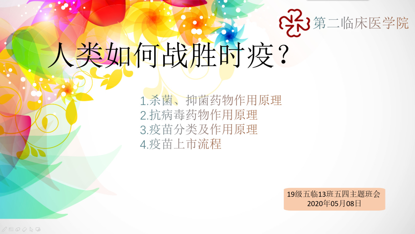 5月8日下午,2019级临床13班兼职班主任黄菁菁老师带领同学们举行了以“人类如何战胜时疫”为主题的班会活动。