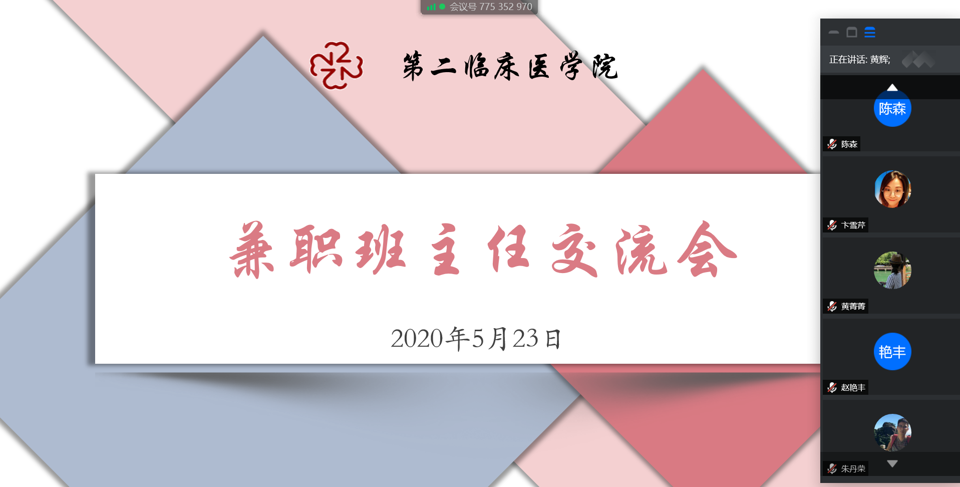 5月23日晚,我院开展2019级本科生兼职班主任线上交流会,副书记黄辉、学工办主任黄琴、辅导员许柯及2019级本科生兼职班主任参会。