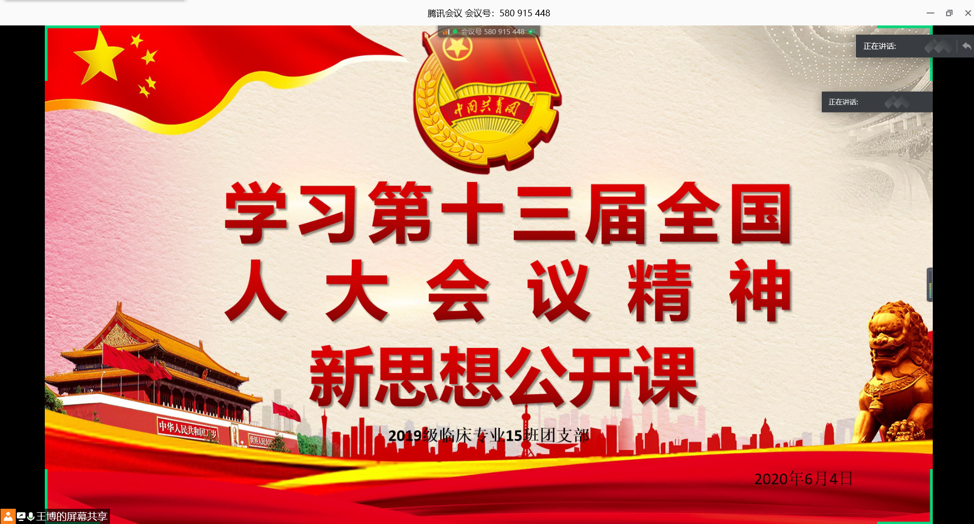 6月4日晚,2019级临床15班全体同学和兼职班主任朱成华老师开展了以“逐梦惟笃行,奋进正当时”为主题的新思想公开课,共同学习了十三届全国人大会议精神。 首先,同学们一起观看了十三届全国人大的开幕式,学习了会议的主要内容。这次会议在统筹推进疫情防控和经济社会发展的关键时刻召开,议程重大、任务艰巨,举国关注、举世瞩目。这是一次民主、团结、求实、奋进的大会,也是一次统一思想、凝心聚力的盛会。随后,同学们对本次会议通过的民法典发表了自己的看法。大家纷纷畅所欲言,思维的火花不断。最后,朱成华老师对本次活动进行总结,并就此前开展的大学生创新创业活动为同学们提供了经验和指导。 通过本次学习,同学们对十三届全国人大会议精神有了更深刻的理解。逐梦惟笃行,奋进正当时。希望同学们能更加紧密地团结在党中央周围,拥护党的领导,增强时不我待的紧迫感,焕发真抓实干的精气神,为祖国的建设添砖加瓦。