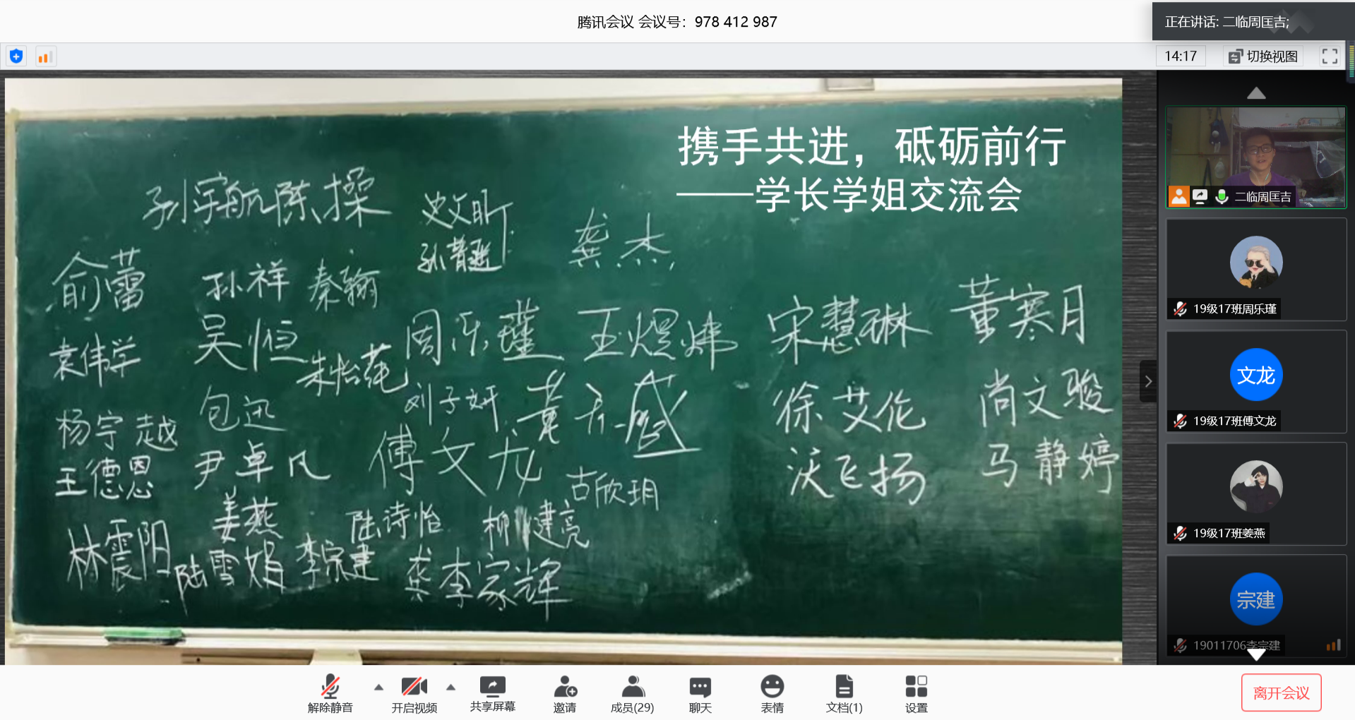 6月6日晚,2019级临床17班学长辅导员们通过腾讯会议给同学们开展了一次线上学长学姐交流会,旨在帮助同学们提升学习素质、提高学习效率。