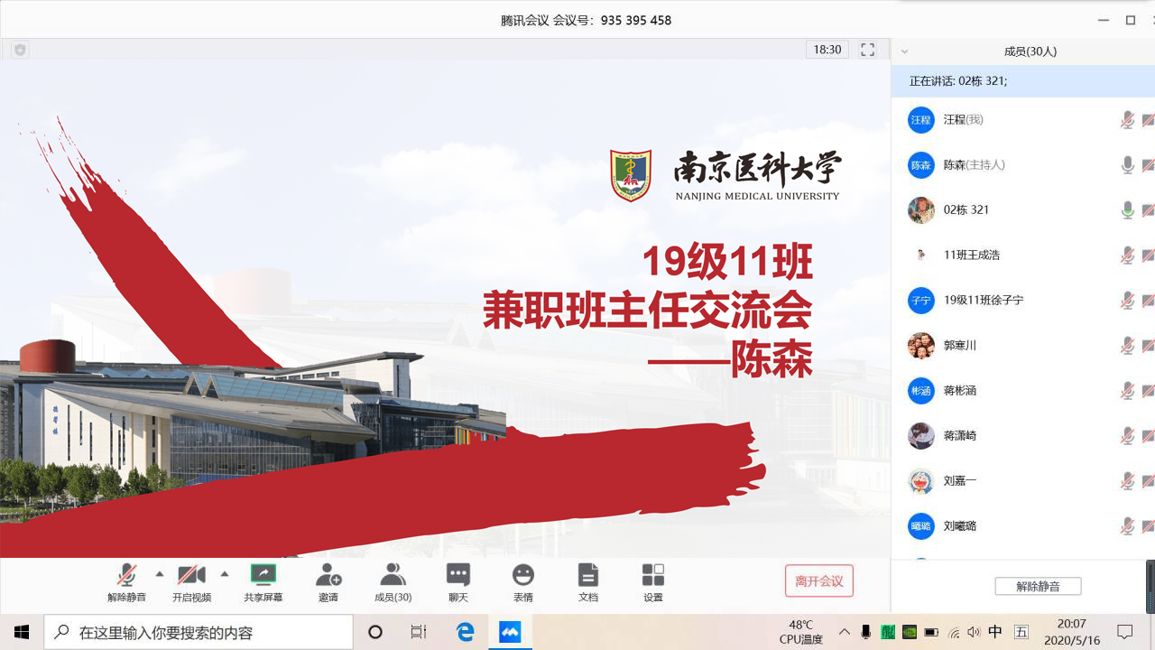 5月16日晚,2019级临床11班兼职班主任陈森老师带领同学们开展了以“同风雨共患难,坚决打赢疫情战”为主题的班会活动,班级全体同学参会。
