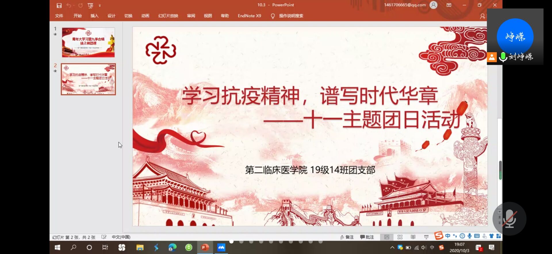 10月3日晚,我院2019级临床14班全体同学通过腾讯会议开展了青年大学习汇报线上会议,由团支书刘峥嵘同学做青年大学习第九季合辑汇报。