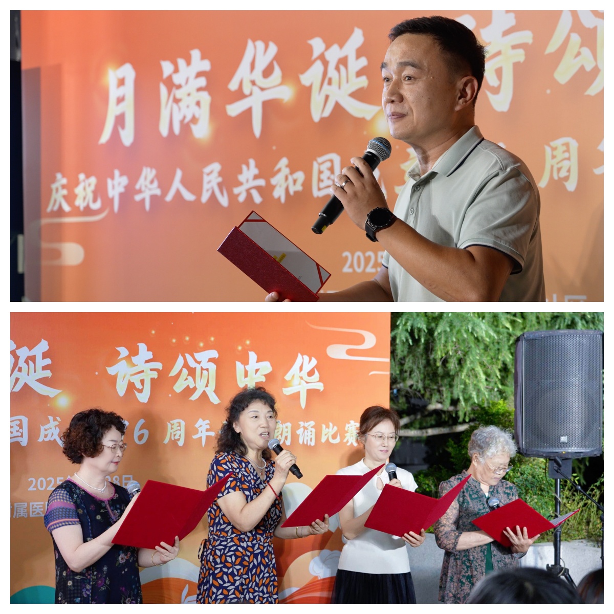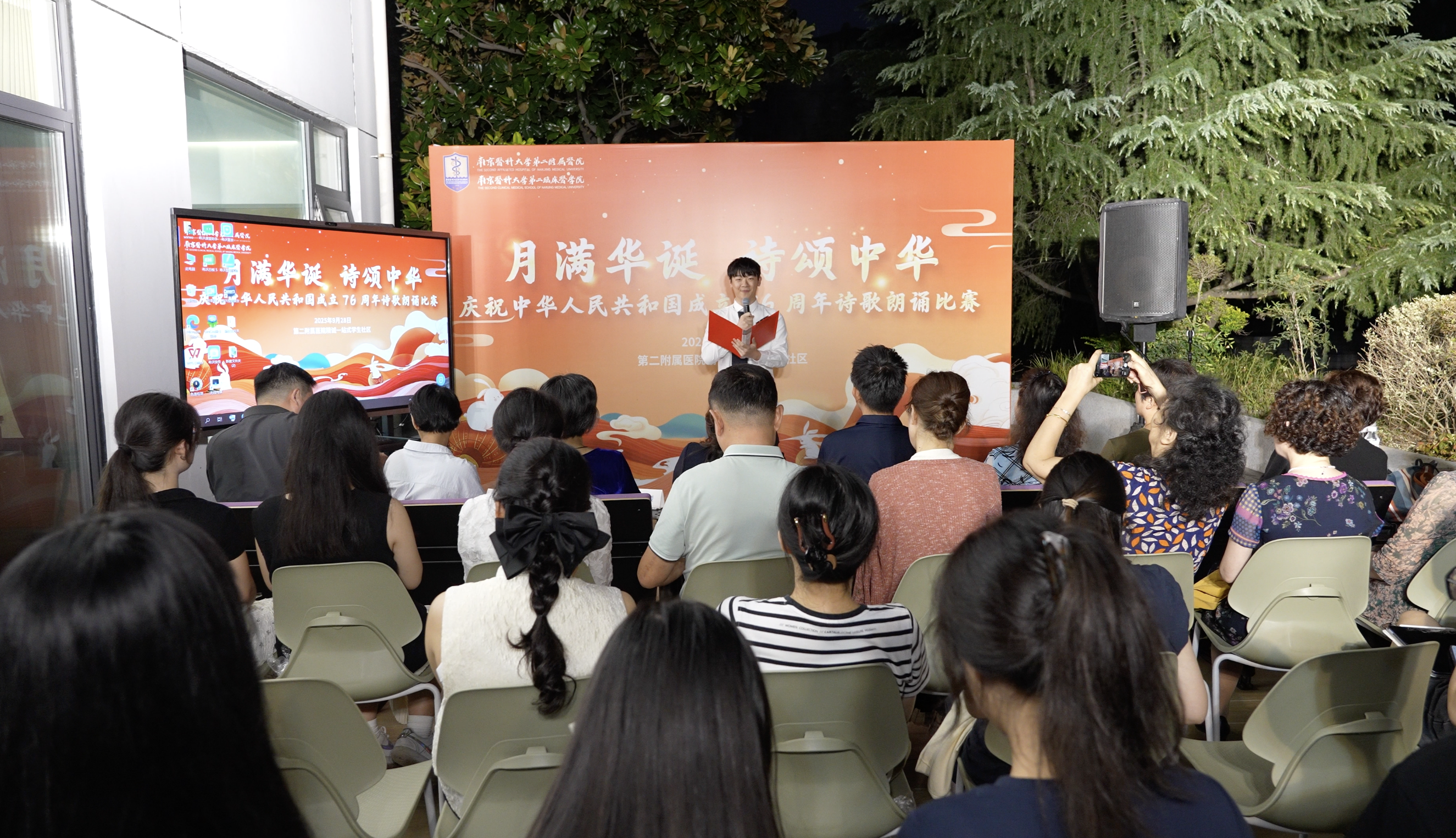 在庆祝中华人民共和国成立76周年中国传统佳节中秋节到来之际为进一步弘扬爱国主义精神,传承中华优秀传统文化丰富社区文化建设,928日晚,南京医科大学第二附属医院精诚一站式学生社区成功举办了“月满华诞,诗颂中华”诗歌朗诵比赛。本次比赛由精诚社区功能党支部主办,离退休党总支、工会协办。院党委副书记汪洁云老师及相关部门负责人参加了相关活动。