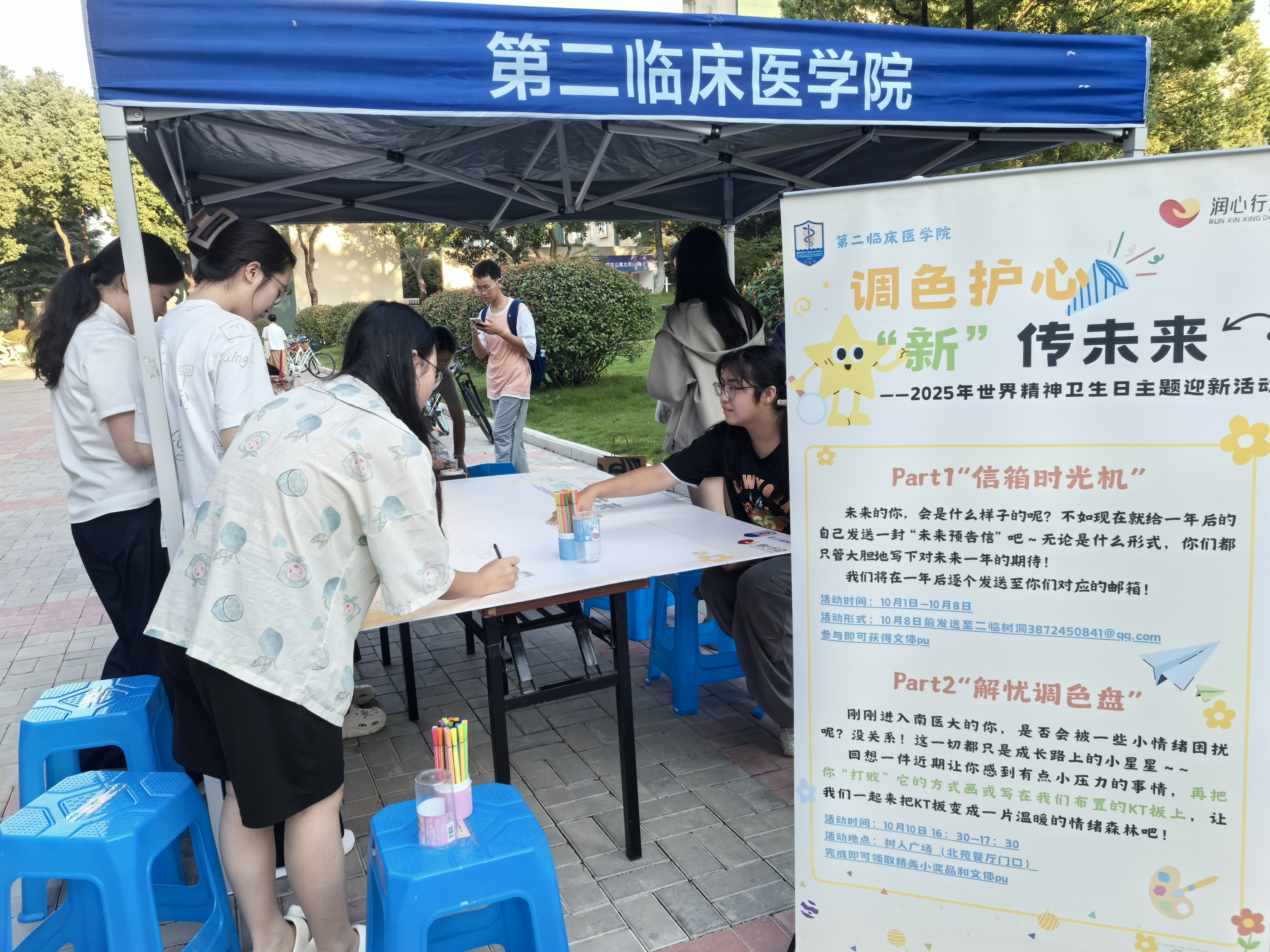 10月10日世界精神卫生日,我院“医心医意”心理辅导站在树人广场举办了“调色护心,‘新’传未来”迎新活动,100多位学生参加活动。