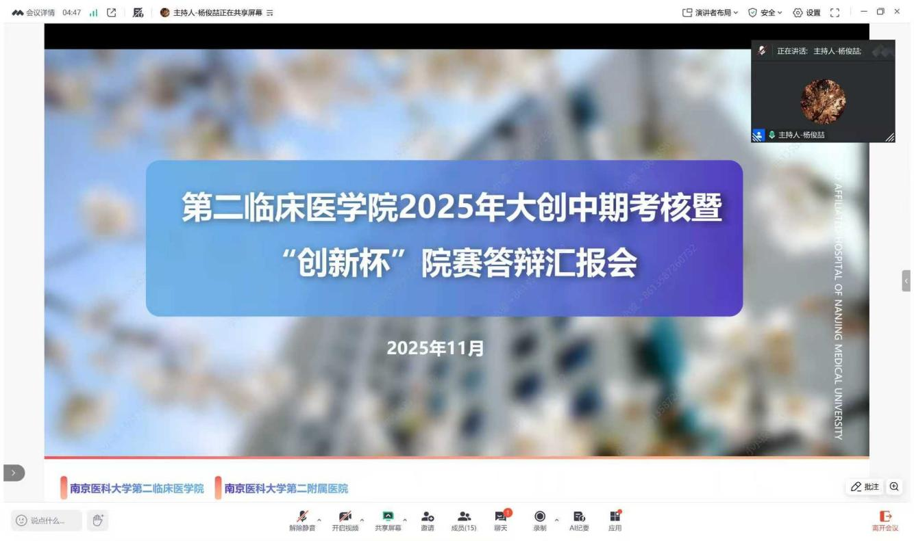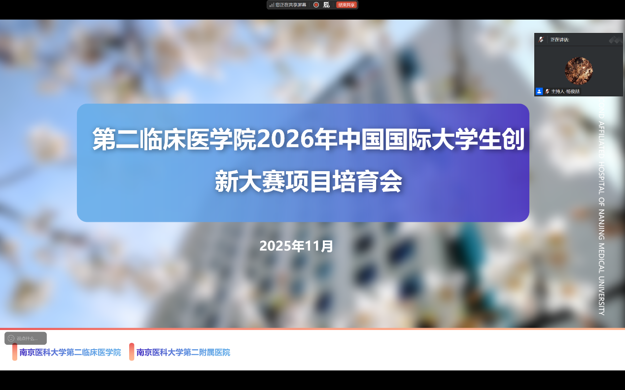2025年11月25日,第二临床医学院分团委科技部举办了2025年大创中期考核暨“创新杯”院赛答辩汇报会。活动由杨俊喆同学主持,本次活动旨在检验各项目的阶段成果,推动项目深化实施,为同学们提供一个展示与交流的学术平台。